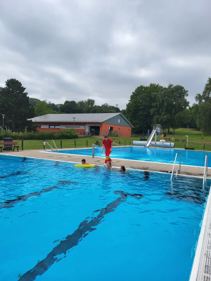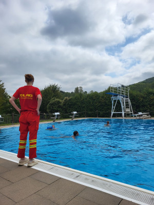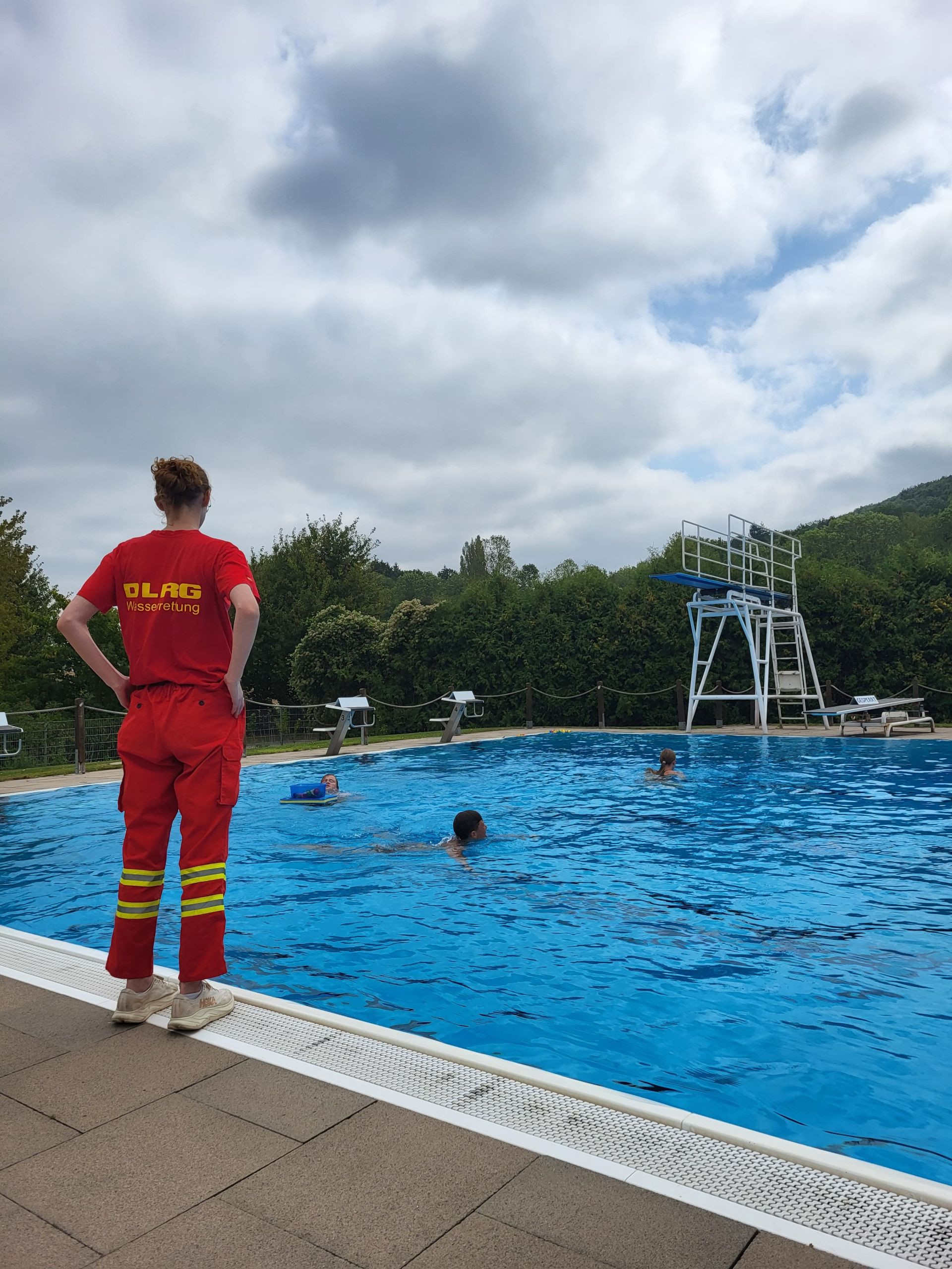 Nachdem sich unsere herangehenden Einsatzkräfte ausgiebig mit den verschiedenen Rettungsgeräten beschäftigt haben, ging es an die praktische Anwendung des Spineboards. Von „Wie soll das denn bitte gehen?“ gelang es mit sauberer Teamarbeit schließlich, die Patientin achsengerecht auf das Spineboard zu bekommen und sicher abzutransportieren. Nach einer kurzen Theoriephase ging es an die praktische Anwendung von Wasserflächenüberwachung in Form der Freibadaufsicht. Abschließend gab es eine Schwimmeinheit, bei dem das Team mit den verschiedenen Rettungsgeräten trainieren konnte.